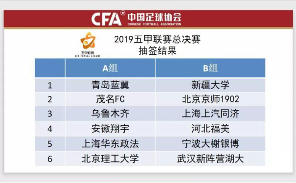 2019中国足协五甲联赛在经历了四大赛区的激烈争夺后,各赛区位列前三的12支队伍相聚美丽的天骄圣地——鄂尔多斯。他们将在未来的一周内继续拼搏,向最后的总冠军发起冲击。比赛先进行小组单循环积分赛,再进行交叉淘汰赛。根据赛制规定,本赛季获得五甲联赛总决赛前两名的球队将与最后两名球队进行升降级附加赛。