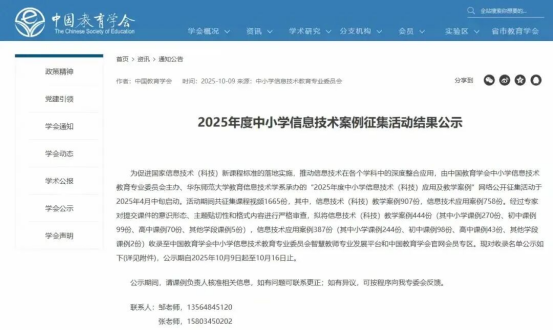 为促进国家信息技术(科技)新课程标准的落地实施,推动信息技术在各个学科中的深度整合应用,中国教育学会中小学信息技术教育专业委员会联合华东师范大学教育信息技术学系开展了“2025年度中小学信息技术(科技)应用及教学案例”网络公开征集活动。