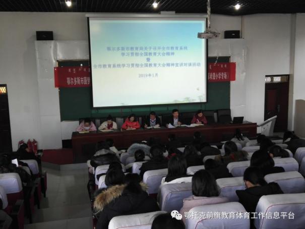 为深入学习领会全国教育大会精神,根据《鄂尔多斯市教育局关于召开全市教育系统学习贯彻全国教育大会精神暨全面从严治党工作视频会议的通知》(鄂教函〔2018〕261号)要求,鄂托克前旗教育体育局制定了学习贯彻全国教育大会精神宣讲对谈活动实施方案,并于近日召开鄂托克前旗教育系统学习贯彻全国教育大会精神暨全面从严治党工作视频会议。