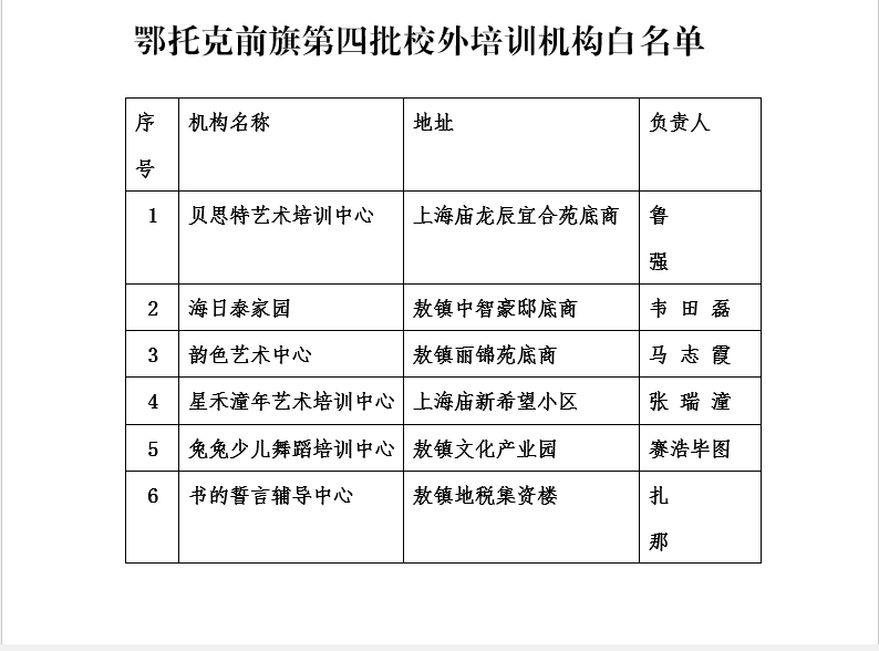 为规范校外培训机构办学行为,切实减轻中小学生课外负担,根据教育部等四部门《关于切实减轻中小学课外负担开展校外培训机构专项治理行动的通知》(教基厅〔2018〕3号)、《内蒙古自治区人民政府办公厅关于做好校外培训机构专项综合治理工作的通知》(内政办字〔2018〕27号)、《鄂尔多斯市人民政府办公厅关于印发鄂尔多斯市校外培训机构专项治理行动实施方案的通知》(鄂府办发〔2018〕42号)、《鄂托克前旗人民政府办公室关于印发校外培训机构专项治理行动实施方案的通知》(鄂前政办发〔2018〕47号)和鄂托克前旗人民政府校外培训机构专项治理联席会议精神要求,现向社会公布“鄂托克前旗第四批校外教育培训机构白名单”,供社会各界共同监督,进一步规范校外培训有序发展,共同打造一个良好的教育生态环境。