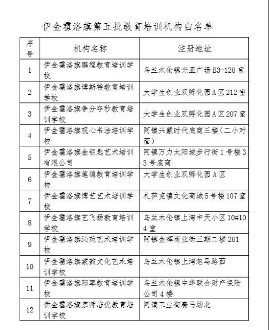 为规范校外培训机构办学行为,切实减轻中小学生课外负担,根据《国务院办公厅关于规范校外培训机构发展的意见》《教育部等四部门关于切实减轻中小学课外负担开展校外培训机构专项治理行动的通知》《内蒙古自治区人民政府办公厅关于做好校外培训机构专项综合治理工作的通知》《鄂尔多斯市人民政府办公厅关于印发鄂尔多斯市校外培训机构专项治理行动实施方案的通知》《伊金霍洛旗人民政府办公室关于印发减轻中小学生课外负担开展校外培训机构专项治理行动实施方案的通知》要求,现向社会公布伊金霍洛旗第五批校外培训机构白名单,供社会各界共同监督,以促进我旗校外培训机构规范有序发展,构建良好教育环境。