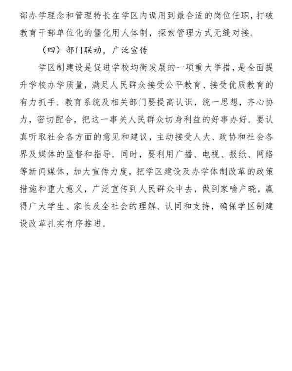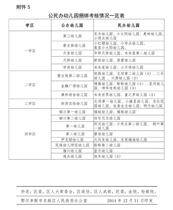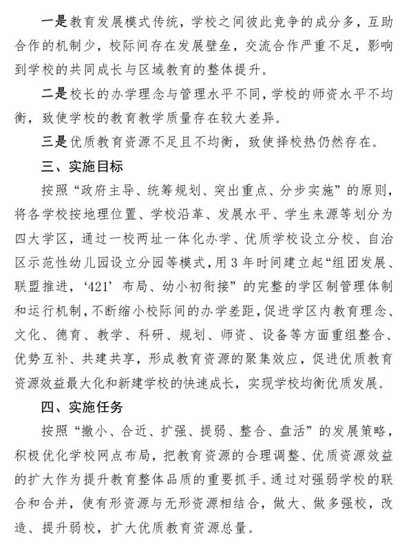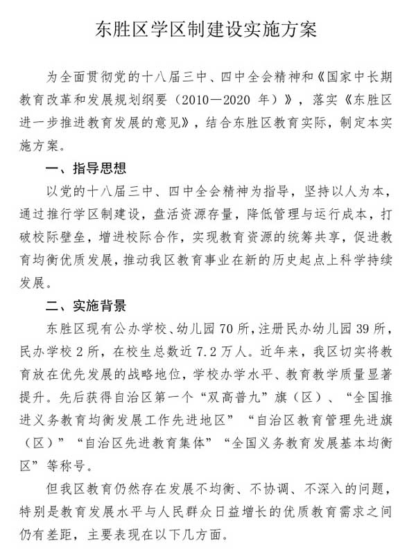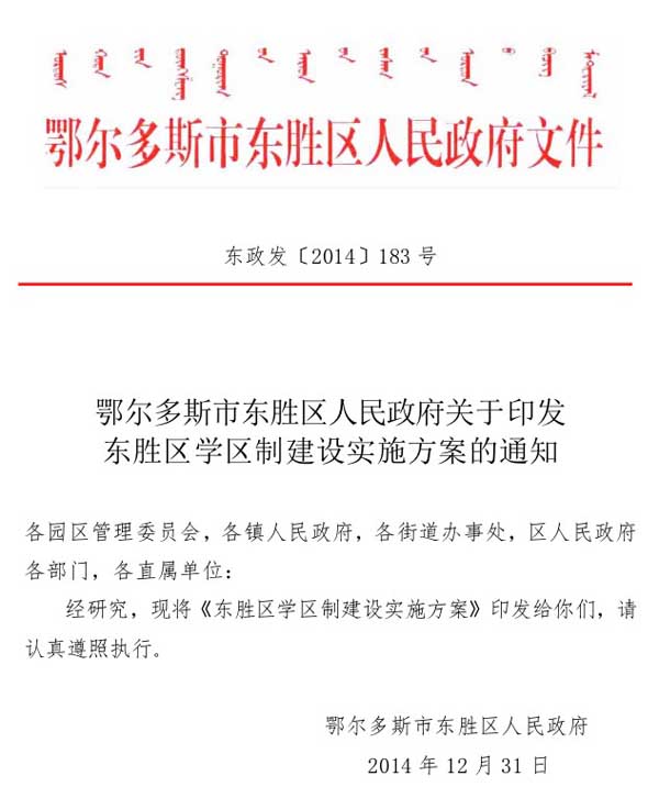 现将《东胜区人民政府关于印发东胜区学区制建设实施方案>的通知》(东政发(2014)183号)转发给你们,请研究借鉴。2014年,东胜区在自治区各旗区县率先通过国家县域义务教育均衡发展督导评估验收,在推进义务教育均衡发展历程中迈出了坚实步伐。东胜区为了在已有基础上实现新的发展与跨越,根据国家、自治区政策和市教育局要求,借鉴教育先进地区经验,充分结合自身教育改革发展的实际,制定出该实施方案,并从2015年起付诸实施。请各旗区在推进有关工作进程中积极探索实施符合实际、适合发展的“学区制”改革,统筹资源、延展优势、提升品质,不断推动县域内义务教育优质均衡发展。