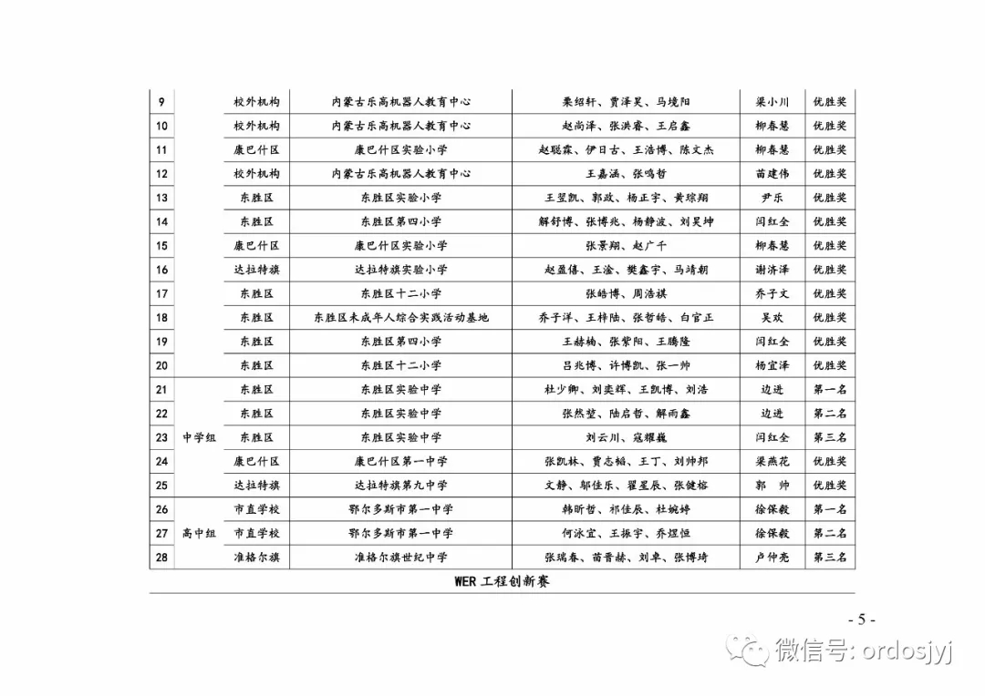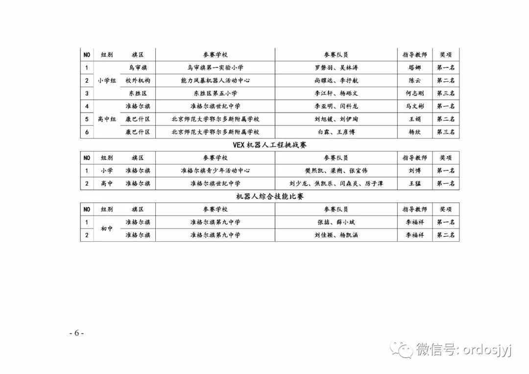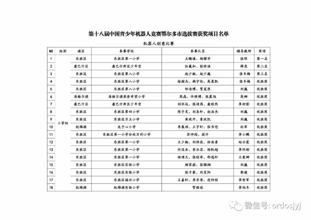 由鄂尔多斯市科学技术协会、鄂尔多斯市教育局联合举办的第十八届中国青少年机器人竞赛鄂尔多斯市选拔赛已经闭幕。经过紧张激烈的比赛,共有 10 个参赛队获得一等奖,8 个参赛队获得二等奖,7 个参赛队获得三等奖,42 个参赛队获得优胜奖,现将比赛结果予以公布。