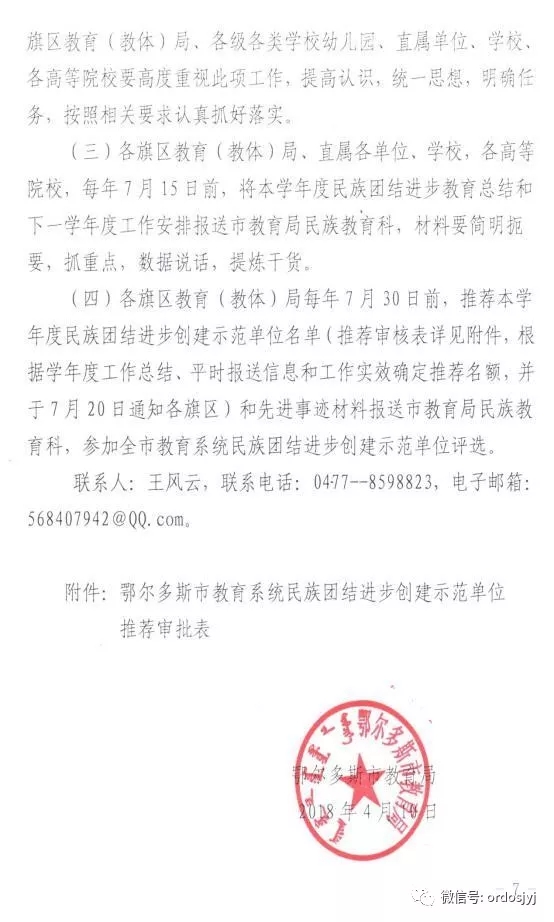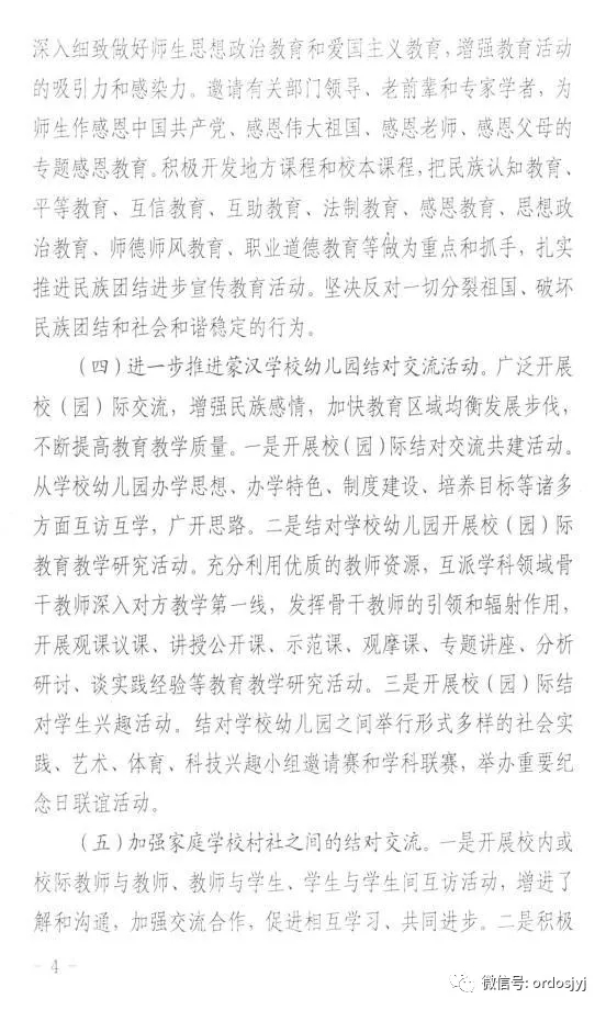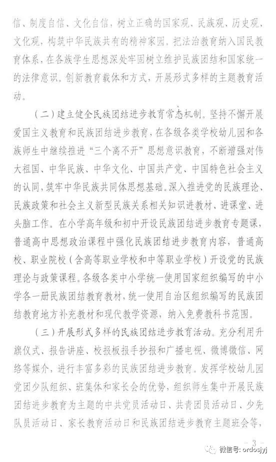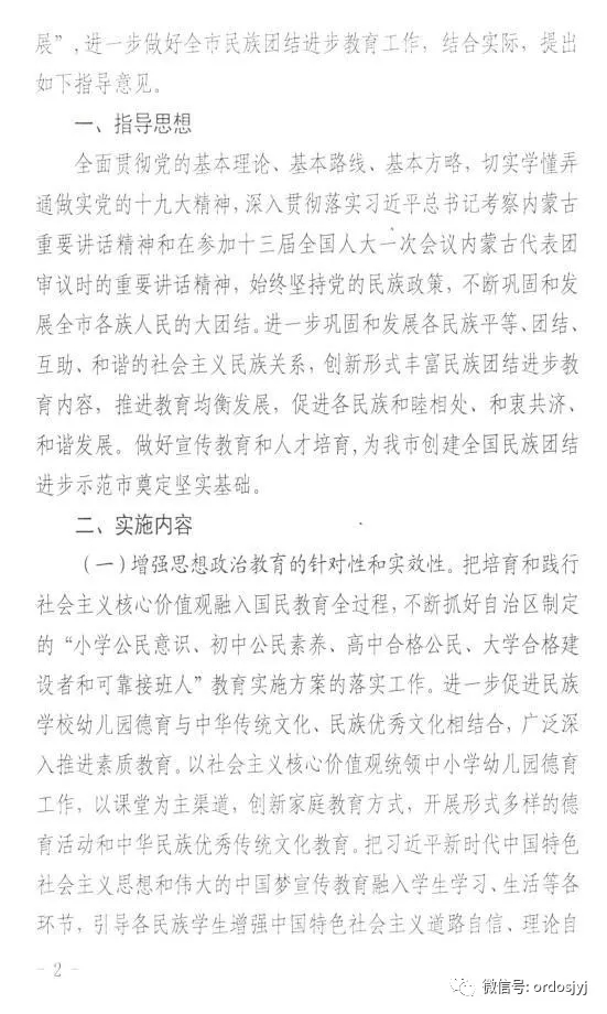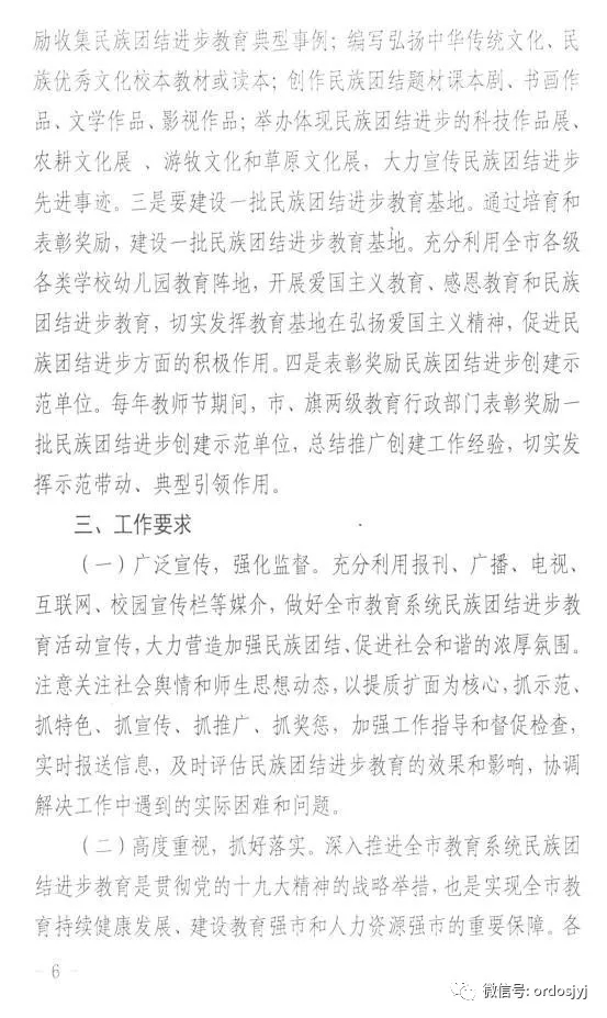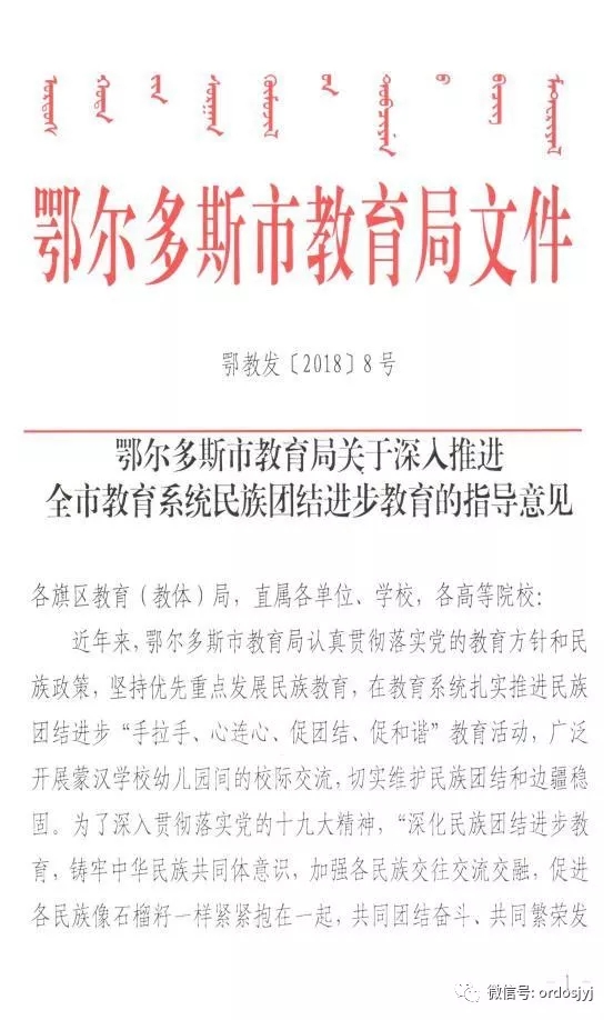为认真学习贯彻落实党的十九大精神,进一步做好民族团结进步教育工作,鄂尔多斯市教育局近日印发了《鄂尔多斯市教育局关于深入推进全市教育系统民族团结进步教育的指导意见》(鄂教发〔2018〕8号),进一步巩固和发展各民族平等、团结、互助、和谐的社会主义民族关系,创新形式丰富民族团结进步教育内容,推进教育均衡发展,促进各民族和睦相处、和衷共济、和谐发展。