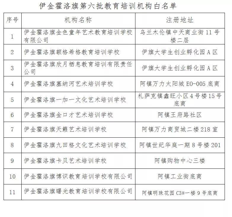 为规范校外培训机构办学行为,切实减轻中小学生课外负担,根据《国务院办公厅关于规范校外培训机构发展的意见》《教育部等六部门关于切实减轻中小学课外负担开展校外培训机构专项治理行动的通知》《内蒙古自治区人民政府办公厅关于做好校外培训机构专项综合治理工作的通知》《鄂尔多斯市人民政府办公厅关于印发鄂尔多斯市校外培训机构专项治理行动实施方案的通知》《伊金霍洛旗人民政府办公室关于印发减轻中小学生课外负担开展校外培训机构专项治理行动实施方案的通知》要求,现向社会公布伊金霍洛旗第六批校外培训机构白名单,供社会各界共同监督,以促进伊旗校外培训机构规范有序发展,构建良好教育环境。